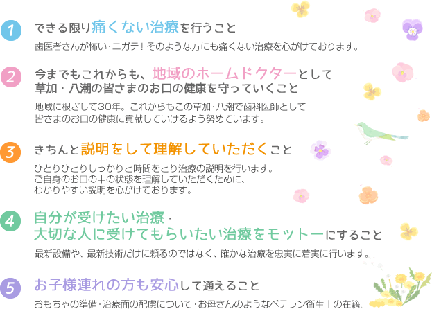 - 当院は、おかげさまで開院32年。患者さんと何世代にも渡っておつきあいが続いています。だからこそ患者さんとのご縁を大切にしたい。一回一回の診療を大切にしたいと考えております。患者さんが満足してくださって、笑顔で帰っていく姿を見ることが私の一番の喜びです。歯についてお悩みがありましたらお気軽にご相談くださいね。